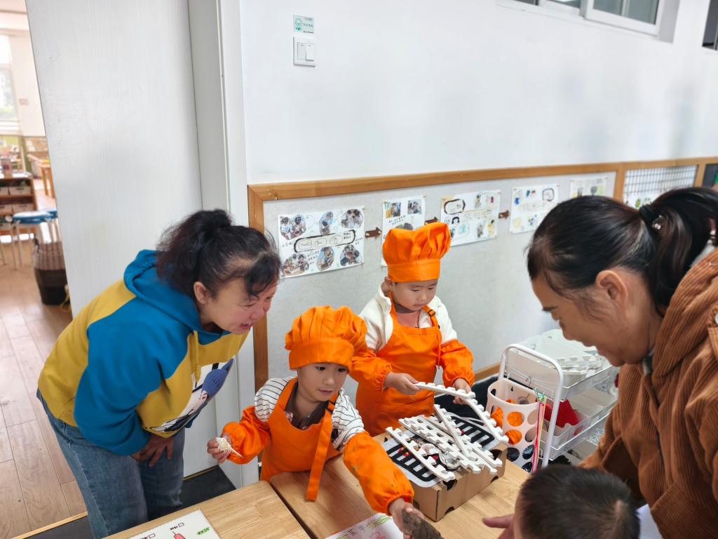 角色游戏时间,“小厨房”“娃娃家”“超市”等游戏区热闹开启。孩子们化身“小厨师”“收银员”自主互动,家长们在观察中深入了解孩子的社会交往能力,部分家长受邀参与游戏,亲子协作的暖心画面成为现场最美风景。午餐环节,家长们看着孩子自主洗手、取餐、安静用餐,真切感受到孩子生活自理能力的显著提升。
